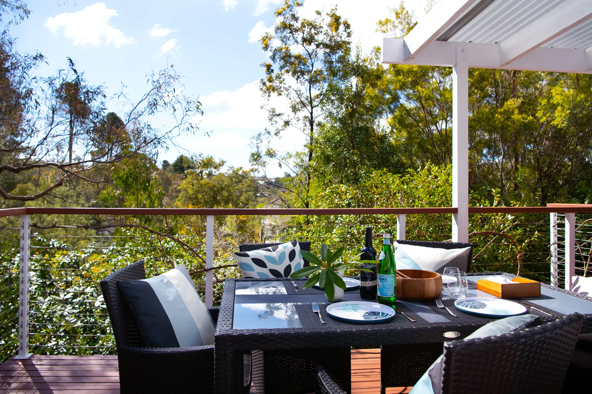 Enter into a beautifully styled living room with leather couches, smart TV and a wood fire. French doors opening out to a deck with outdoor dining. Fully equipped kitchen with modern appliances and beautiful views from every window.