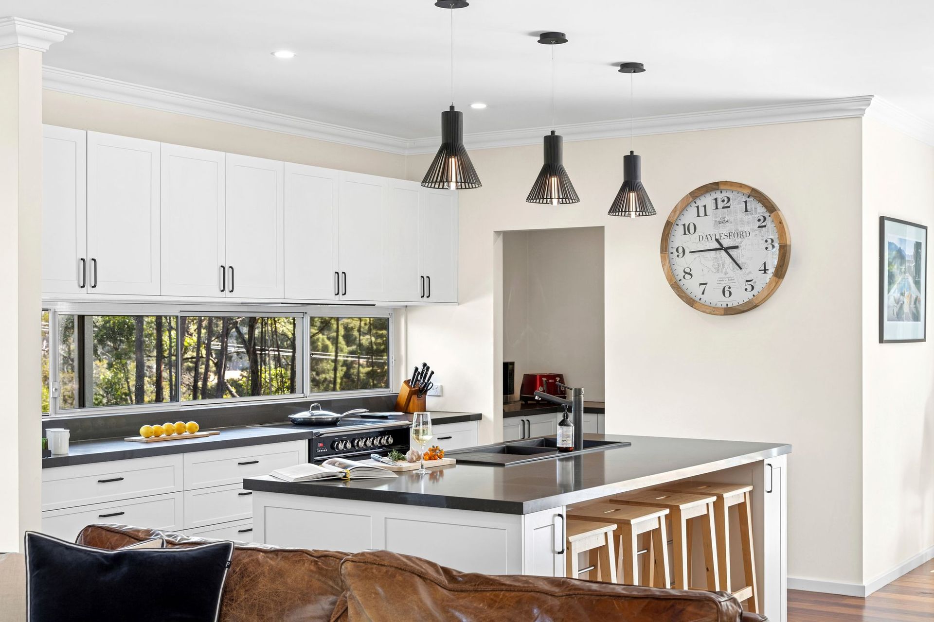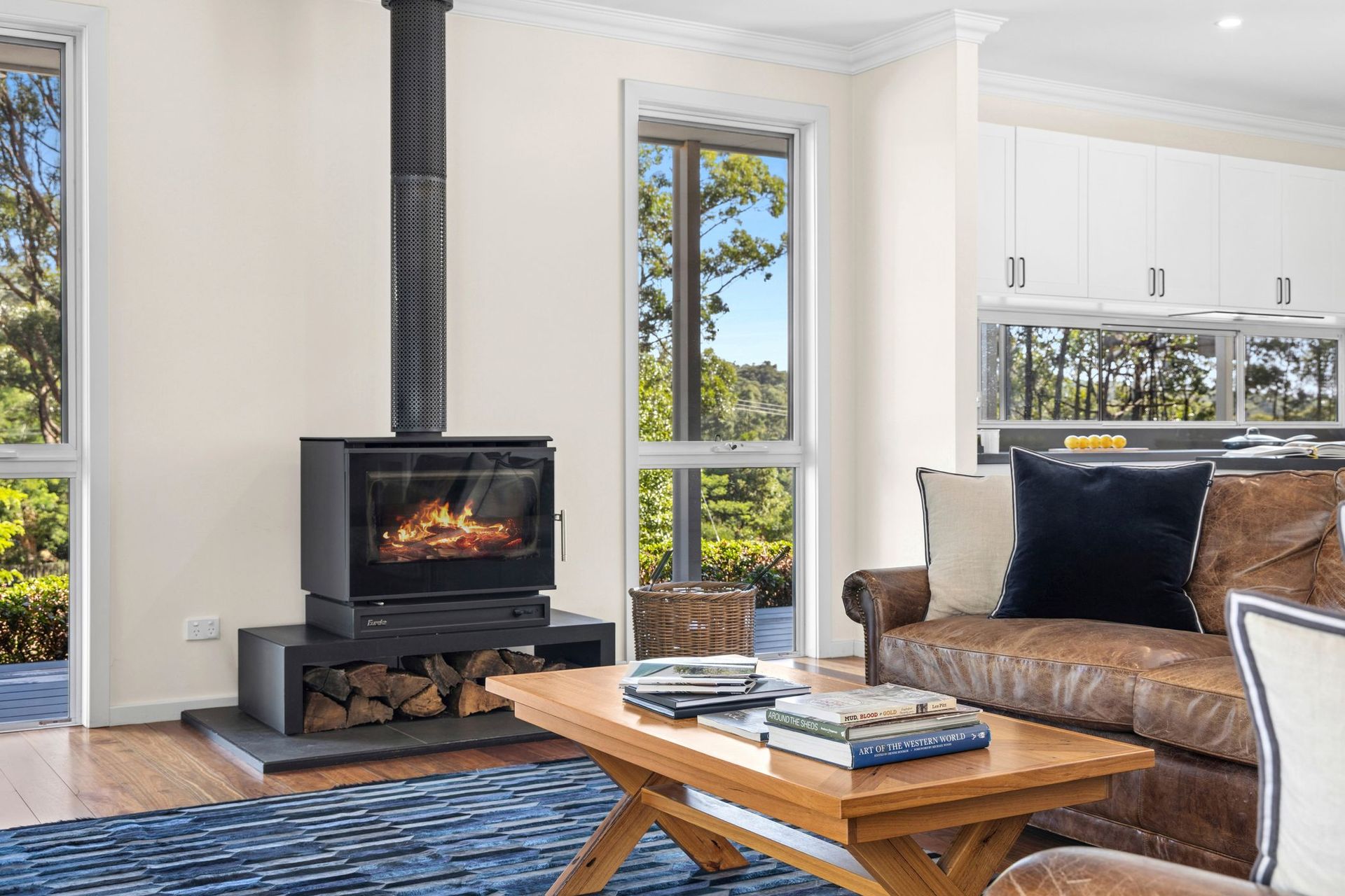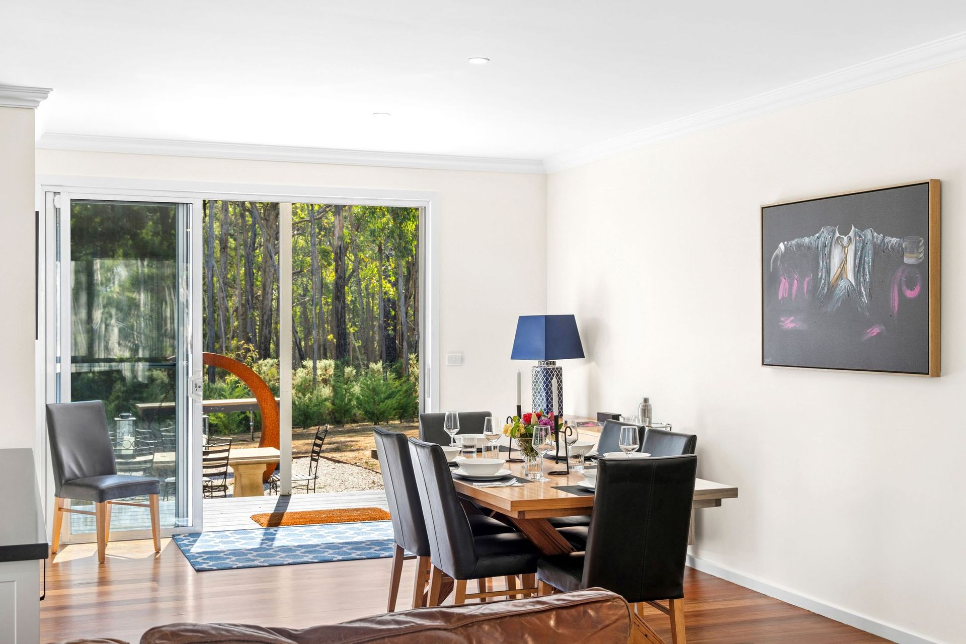 Step inside to a spacious open-plan living and dining area designed for connection and comfort. Gather around the dining table for eight, sink into the leather sofa by the crackling wood fire, and toast the moment with a chilled glass of white or a vibrant Aperol Spritz. Just off the lounge, a cozy single bedroom offers a quiet nook for solo travellers or children. Down the hallway, discover two queen bedrooms and a luxurious master suite with a king bed, ensuite, and its own TV. Each room is thoughtfully styled with plush bedding and curated local artwork. The property is dog freindly but no secure yard and please note there is wildlife around the property.
