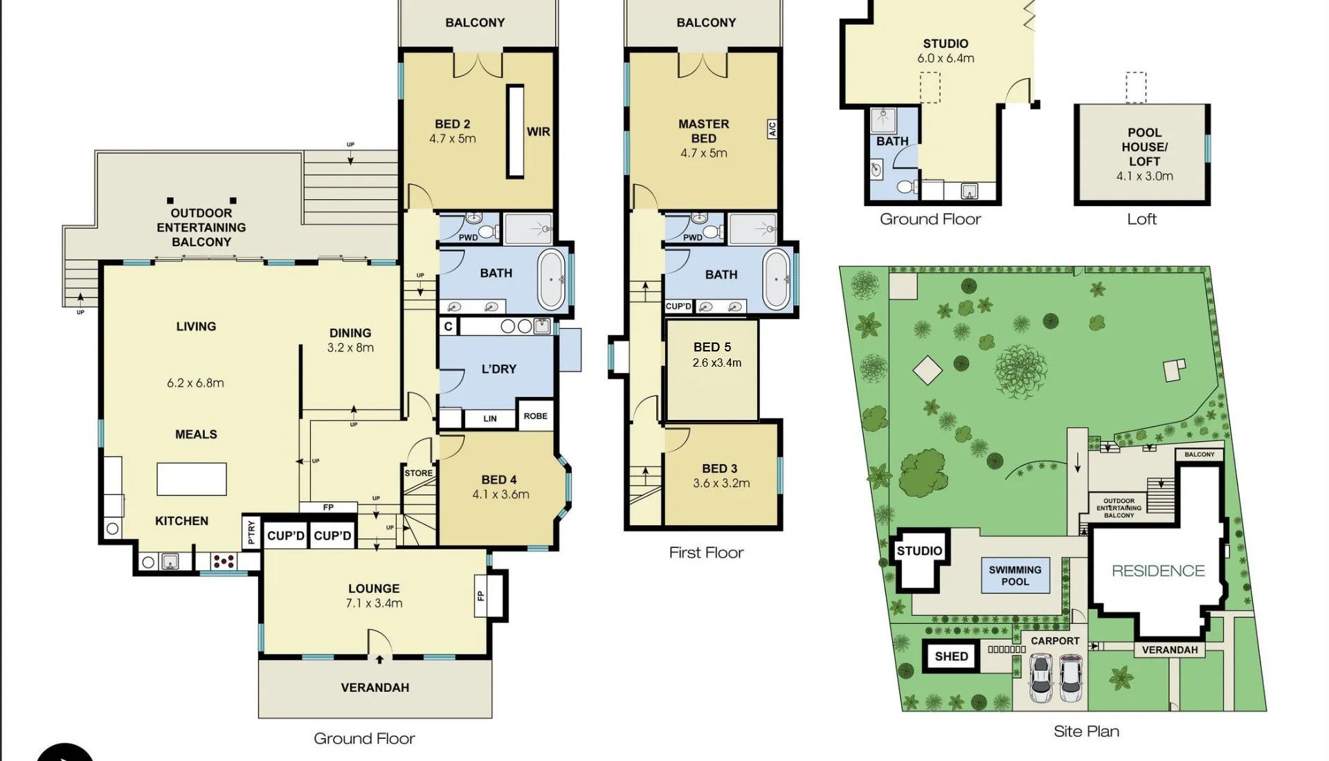 The property boasts an impressive six bedrooms and three bathrooms, ( 5 bedroom in main house and 1 in the studio) making it the ideal destination for family and group accommodations or a girls' weekend. Each bedroom is meticulously decorated, offering a blend of comfort and style. There is a separate studio with a kitchenette, bathroom and king bed located next to the pool. Each rooms has a mixture of king and queen bed and one bedroom has 2 single beds. ( The single beds are ideal for people under 15 years of age) Two bedrooms have the option of king beds to be split into singles.