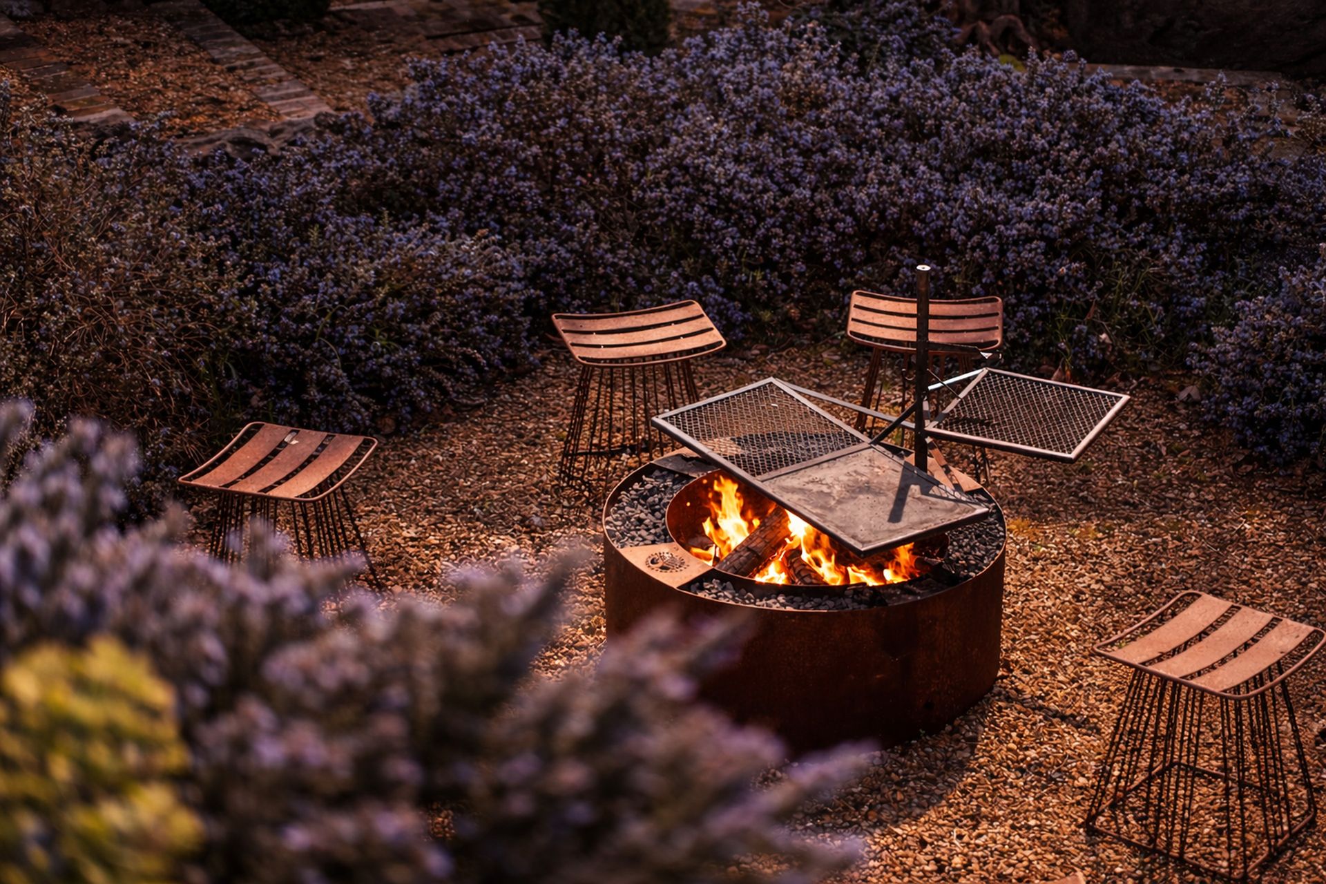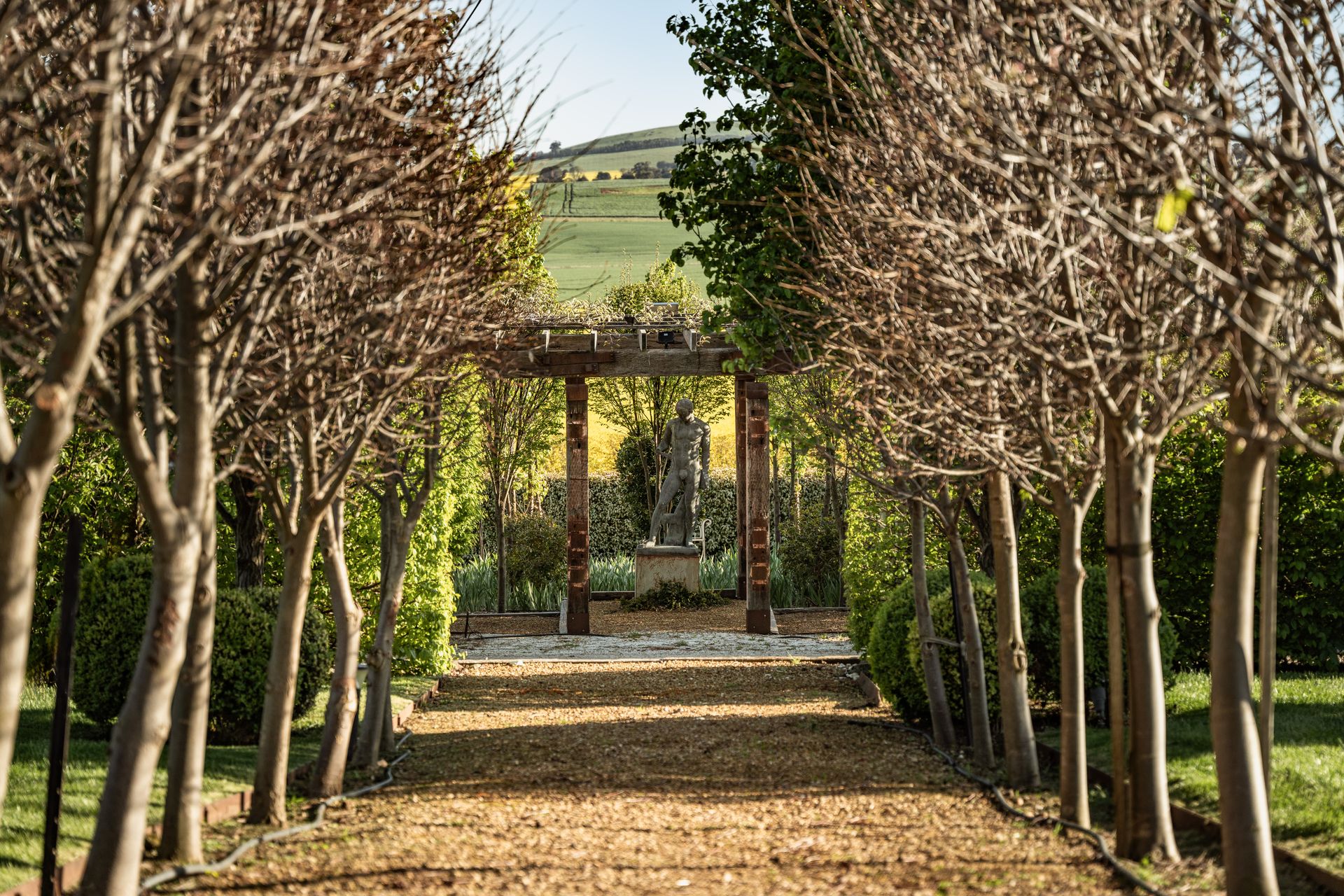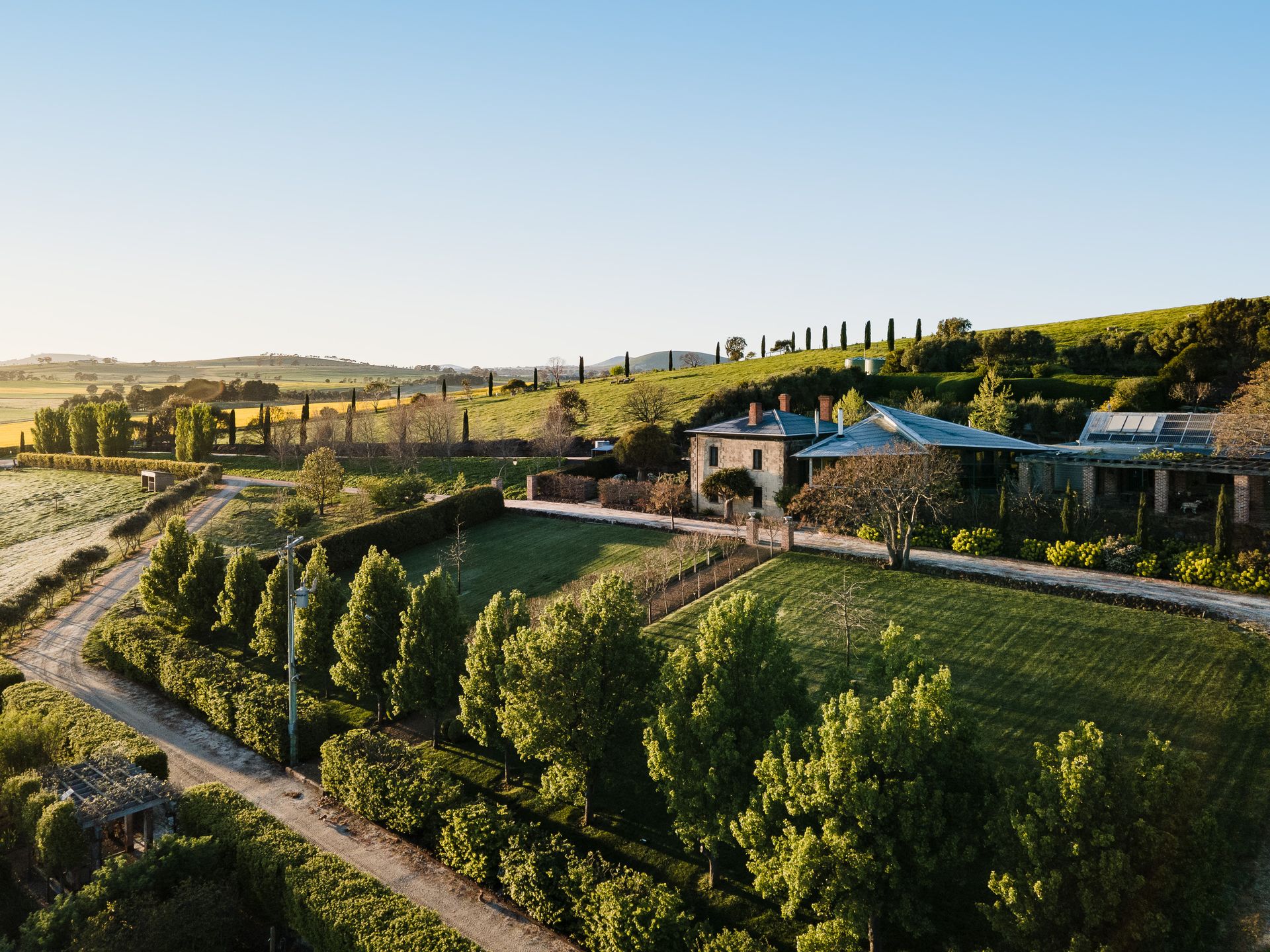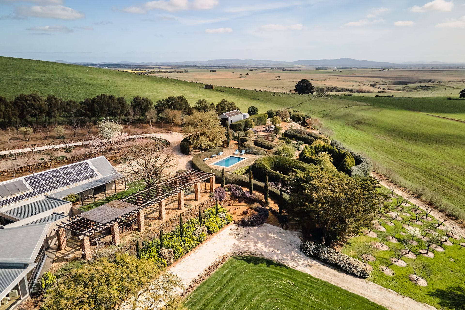 Outside, the estate unfolds into formal terraced gardens, two hectares of paddocks (home to alpacas and hand-raised sheep), and one of Victoria’s largest edible domestic gardens a lush maze of fruit trees and shrubs that feels like something out of a fairy tale. The garden is exquisite: a marquee lawn framed by steel-raised beds with 160 award-winning rose bushes and over 350 fruit trees and edible plants supplying top-tier local restaurants. Sculptural and architectural elements blend classical and modern artistry. A standout feature is the luxurious heated pool with deck and sweeping panoramic views.