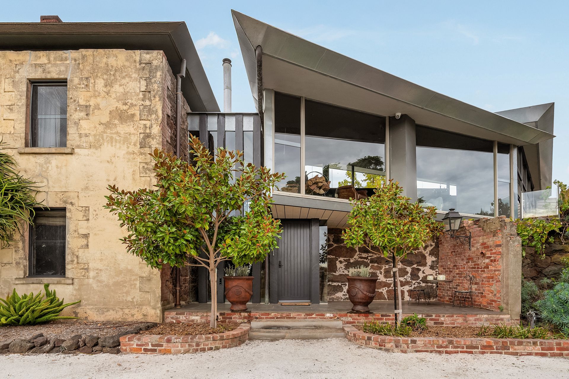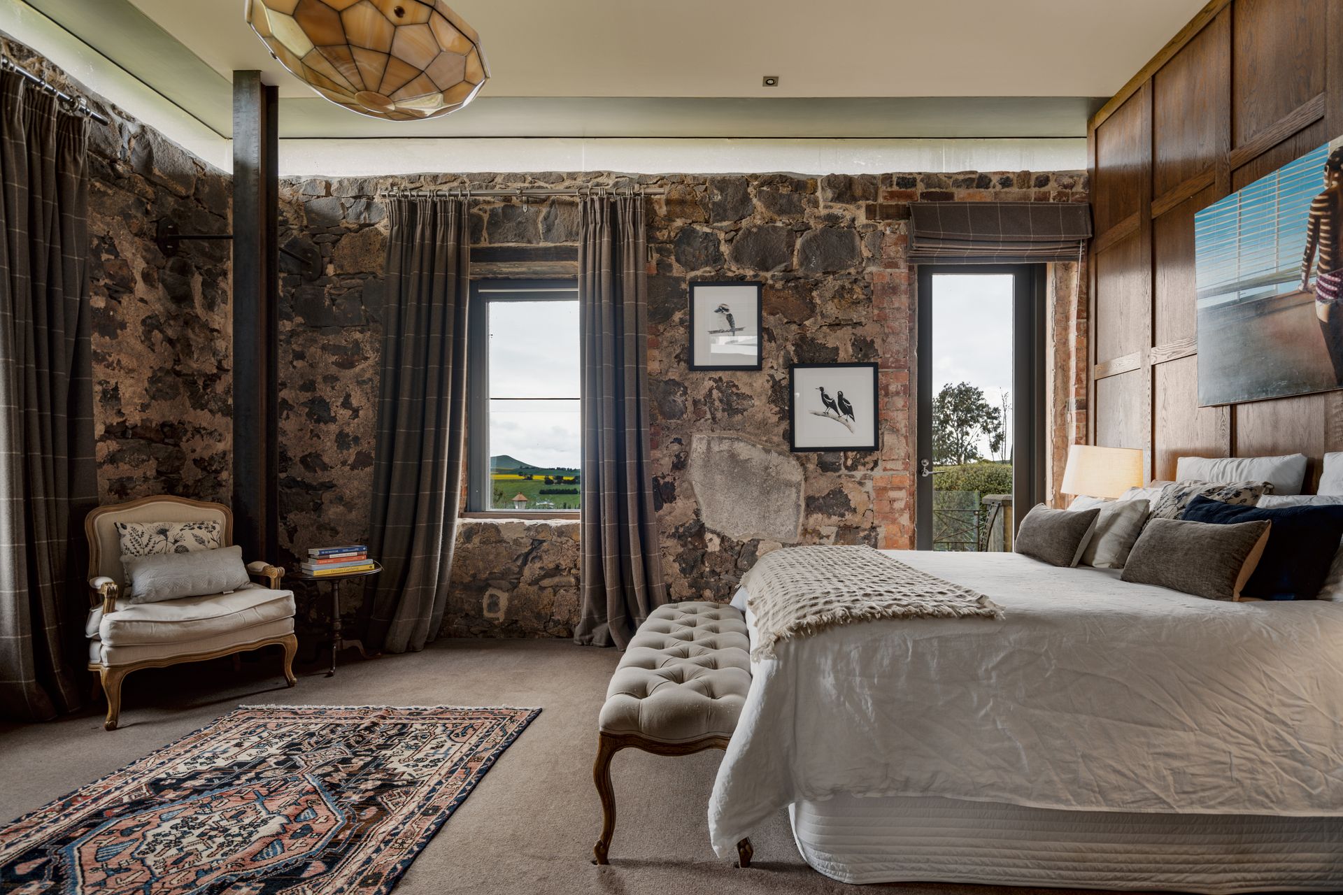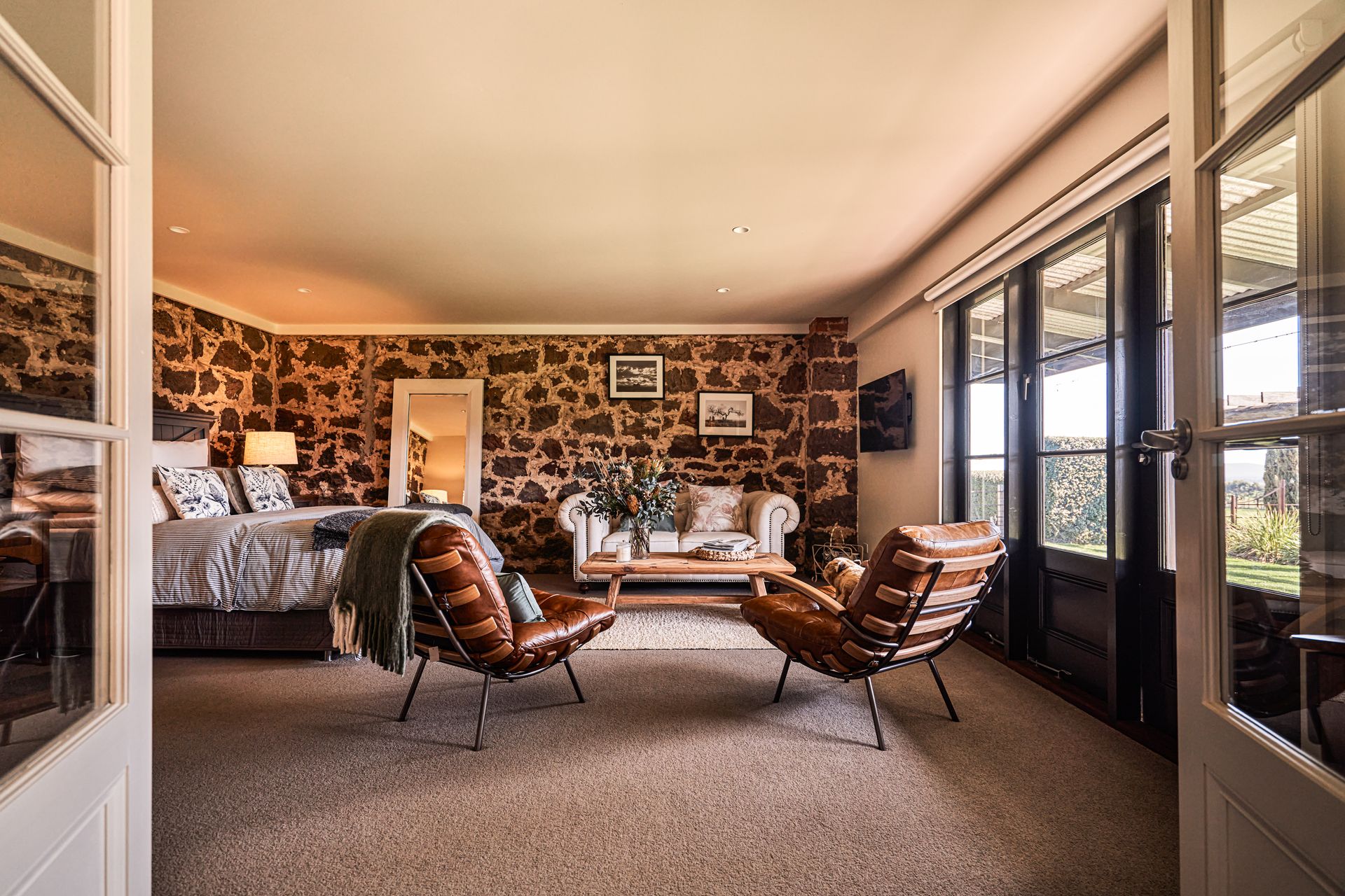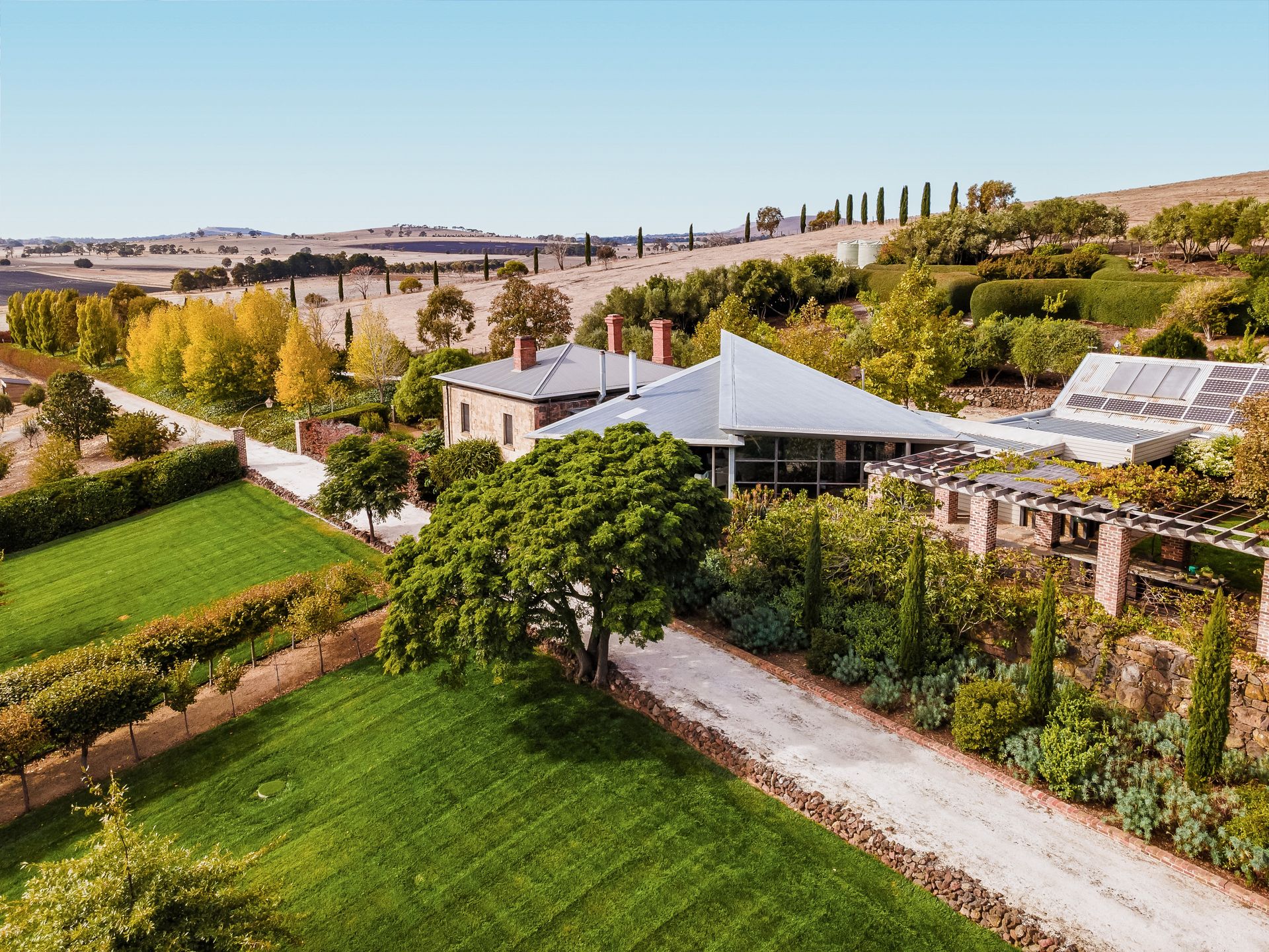 The 1850s original homestead fuses effortlessly into a contemporary masterpiece, preserving its heritage soul while introducing bold architectural flair and panoramic views across the plains. Original bluestone walls, aged hardwood lintels, and sashless windows preserve the 19th-century charm, while a striking industrial steel staircase and expansive glass panel above the stone wall flood the interior with natural light beneath a soaring metal roof. The entertainer’s kitchen features an Aga oven, two Miele ovens, dual dishwashers, and a gas cooktop. The principal suite offers views to Mt Kooroocheang, with a private balcony, ensuite, den, and study. Two generous guest bedrooms share a spa bathroom and lounge. The self-contained barn apartment has the fourth bedroom and includes a lounge, bathroom, and kitchenette.