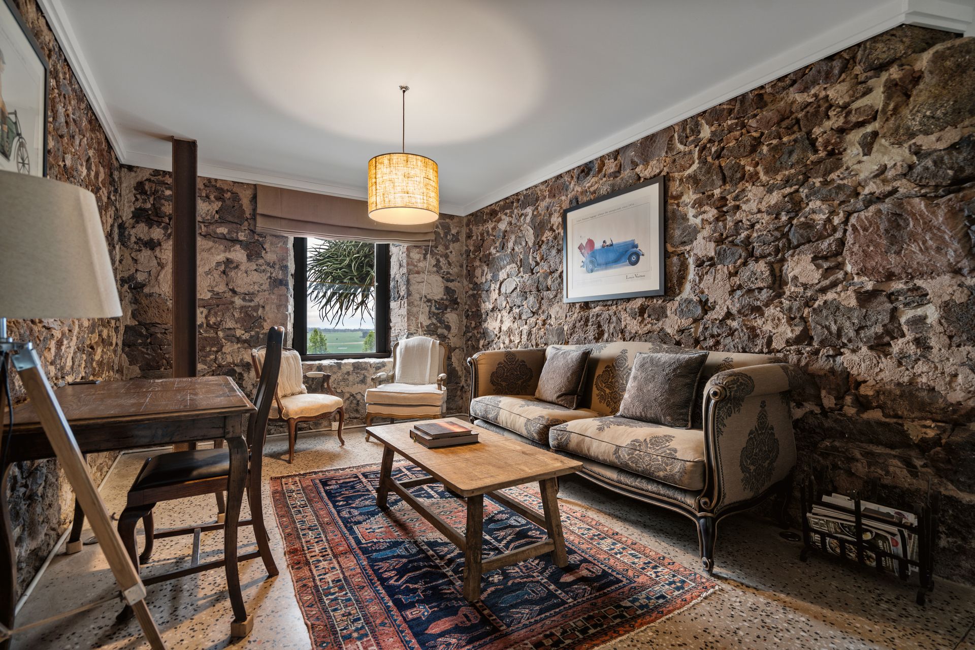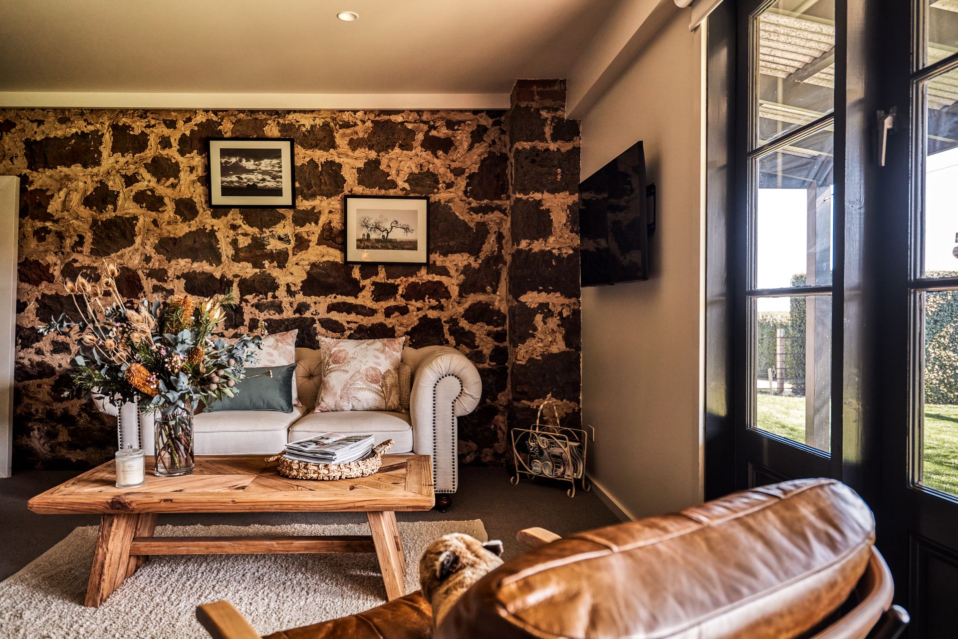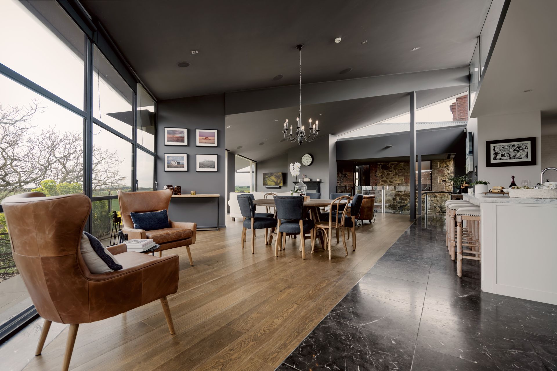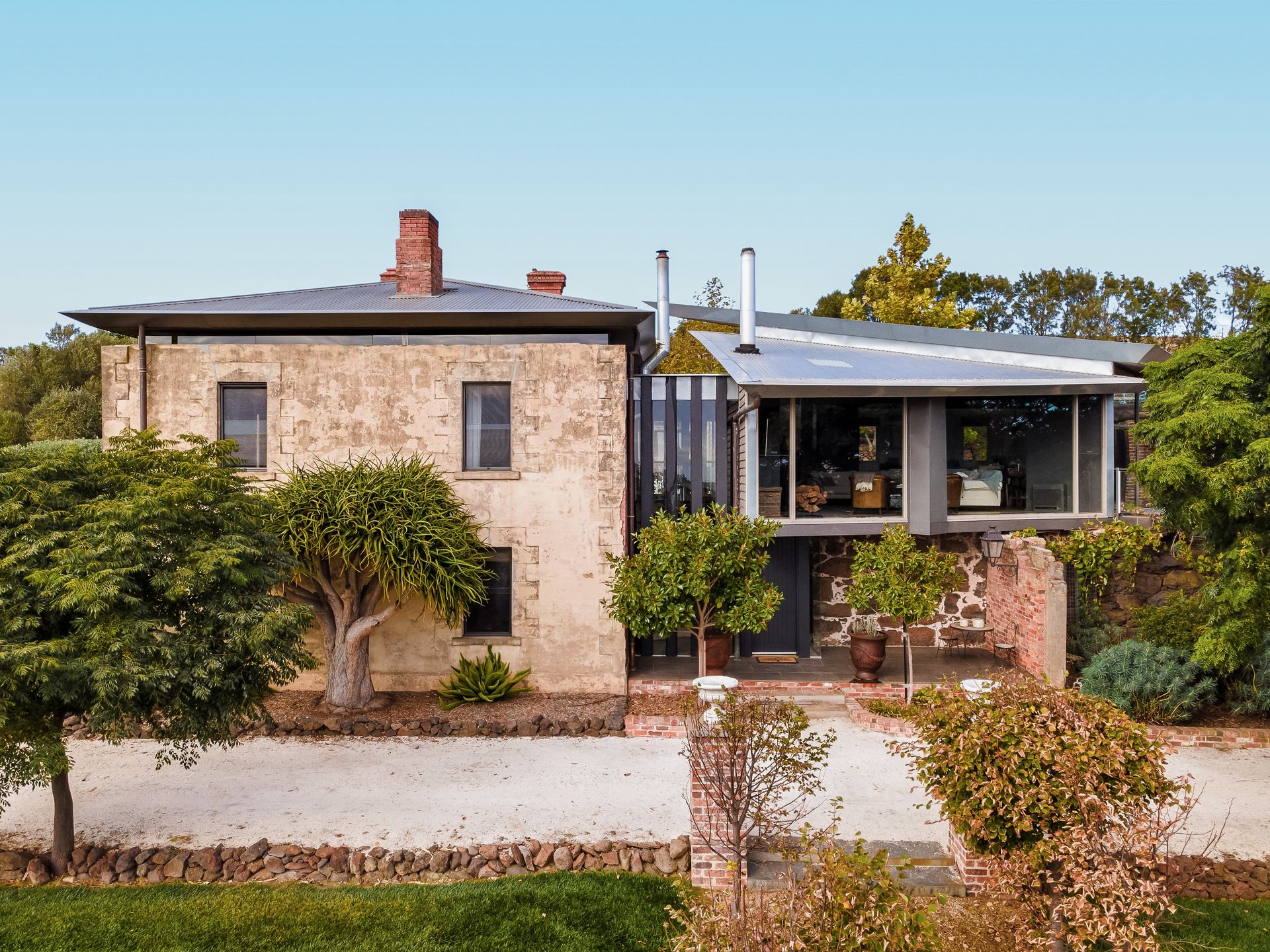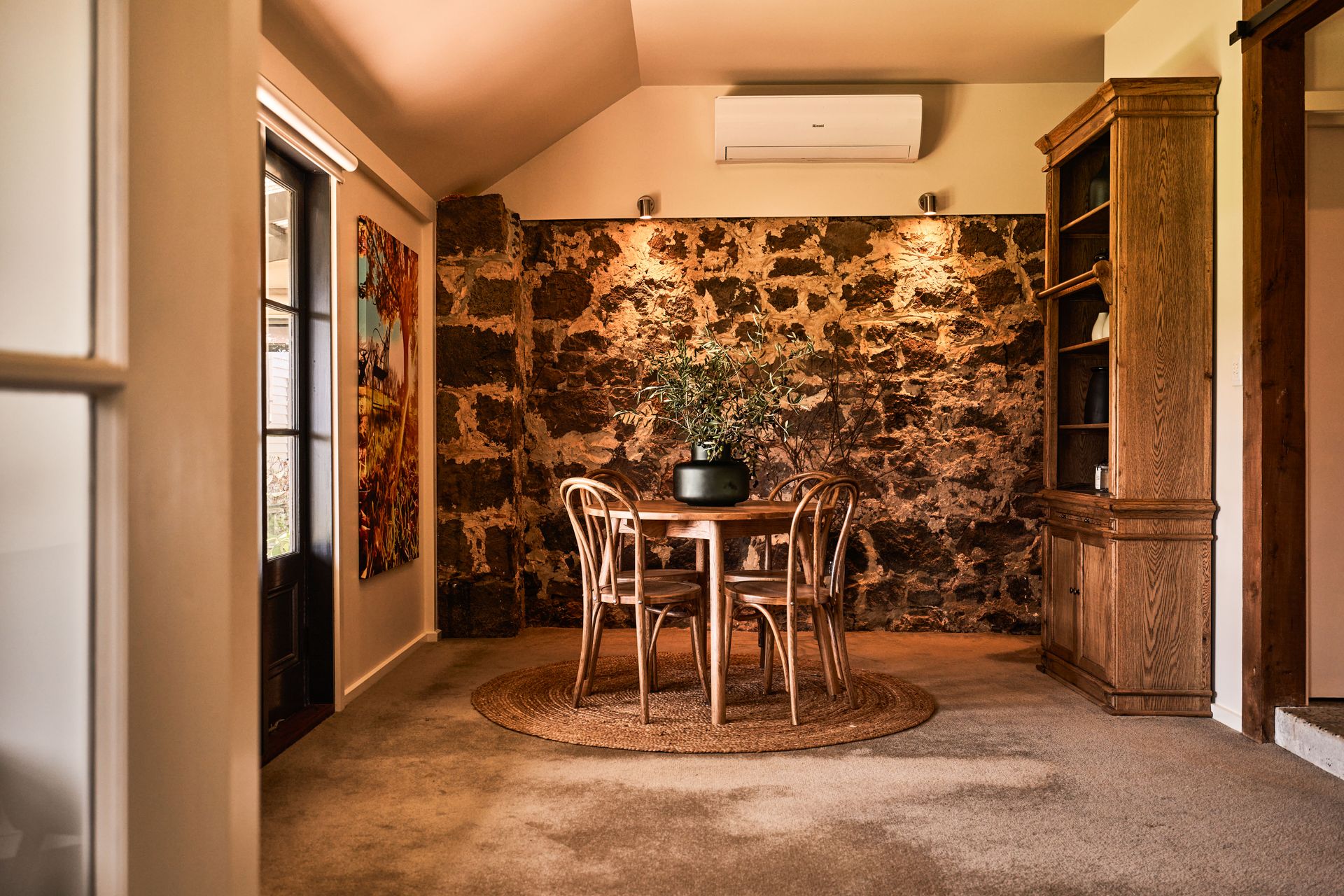 The 1850s original homestead fuses effortlessly into a contemporary masterpiece, preserving its heritage soul while introducing bold architectural flair and panoramic views across the plains. Original bluestone walls, aged hardwood lintels, and sashless windows preserve the 19th-century charm, while a striking industrial steel staircase and expansive glass panel above the stone wall flood the interior with natural light beneath a soaring metal roof. The entertainer’s kitchen features an Aga oven, two Miele ovens, dual dishwashers, and a gas cooktop. The principal suite offers views to Mt Kooroocheang, with a private balcony, ensuite, den, and study. Two generous guest bedrooms share a spa bathroom and lounge. The self-contained barn apartment has the fourth bedroom and includes a lounge, bathroom, and kitchenette.