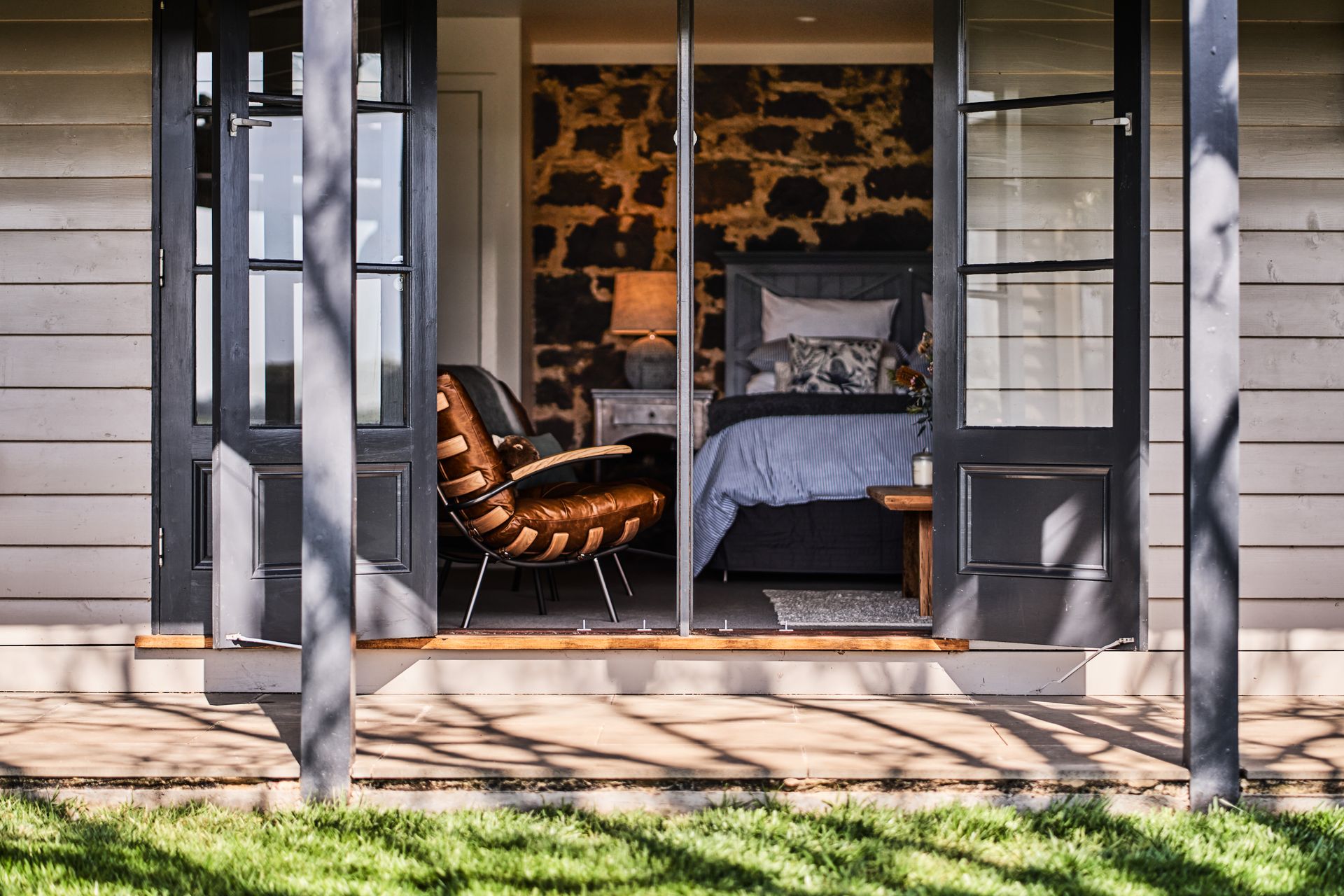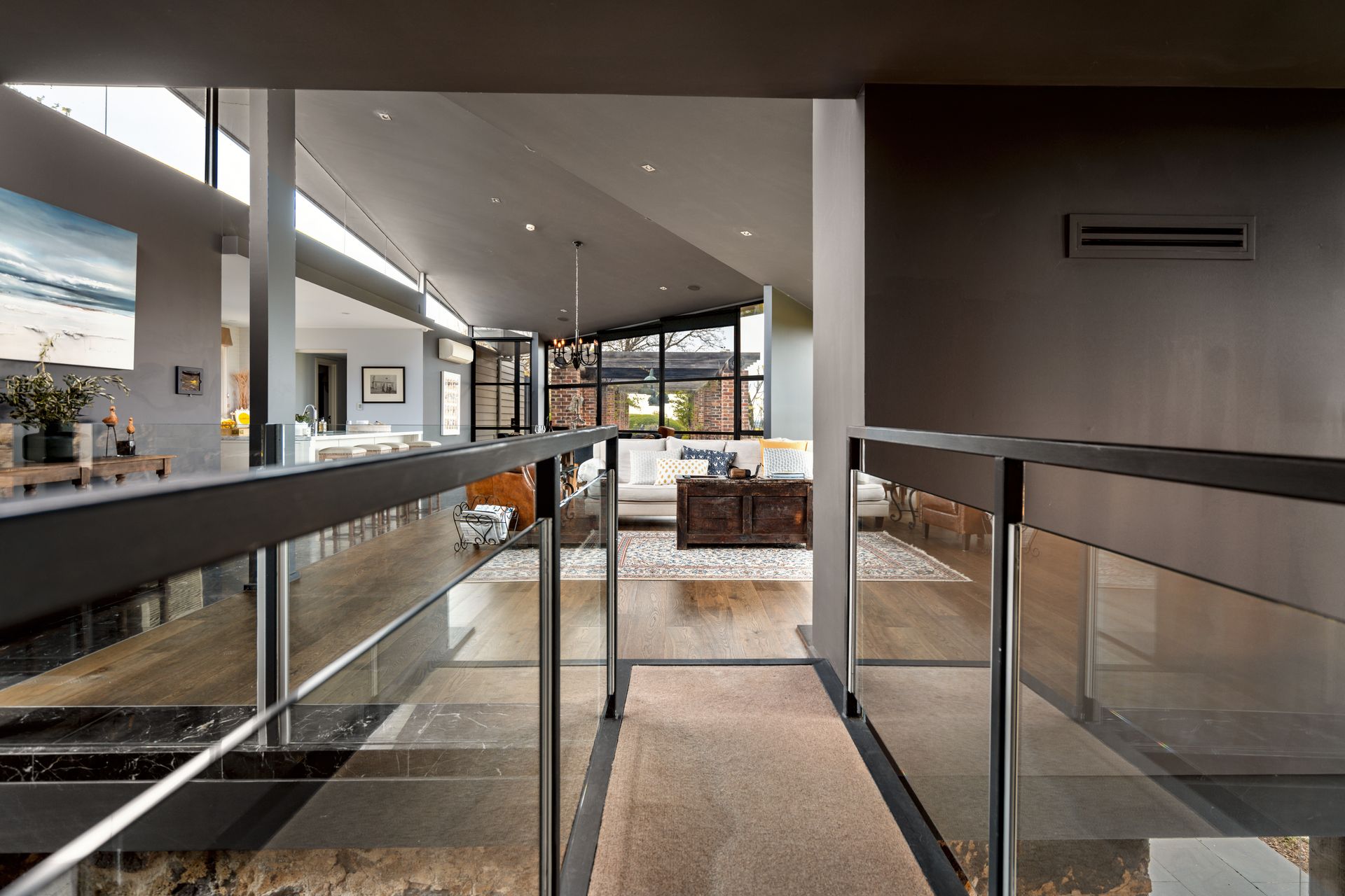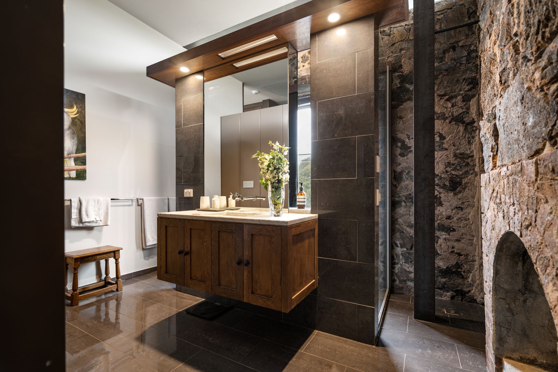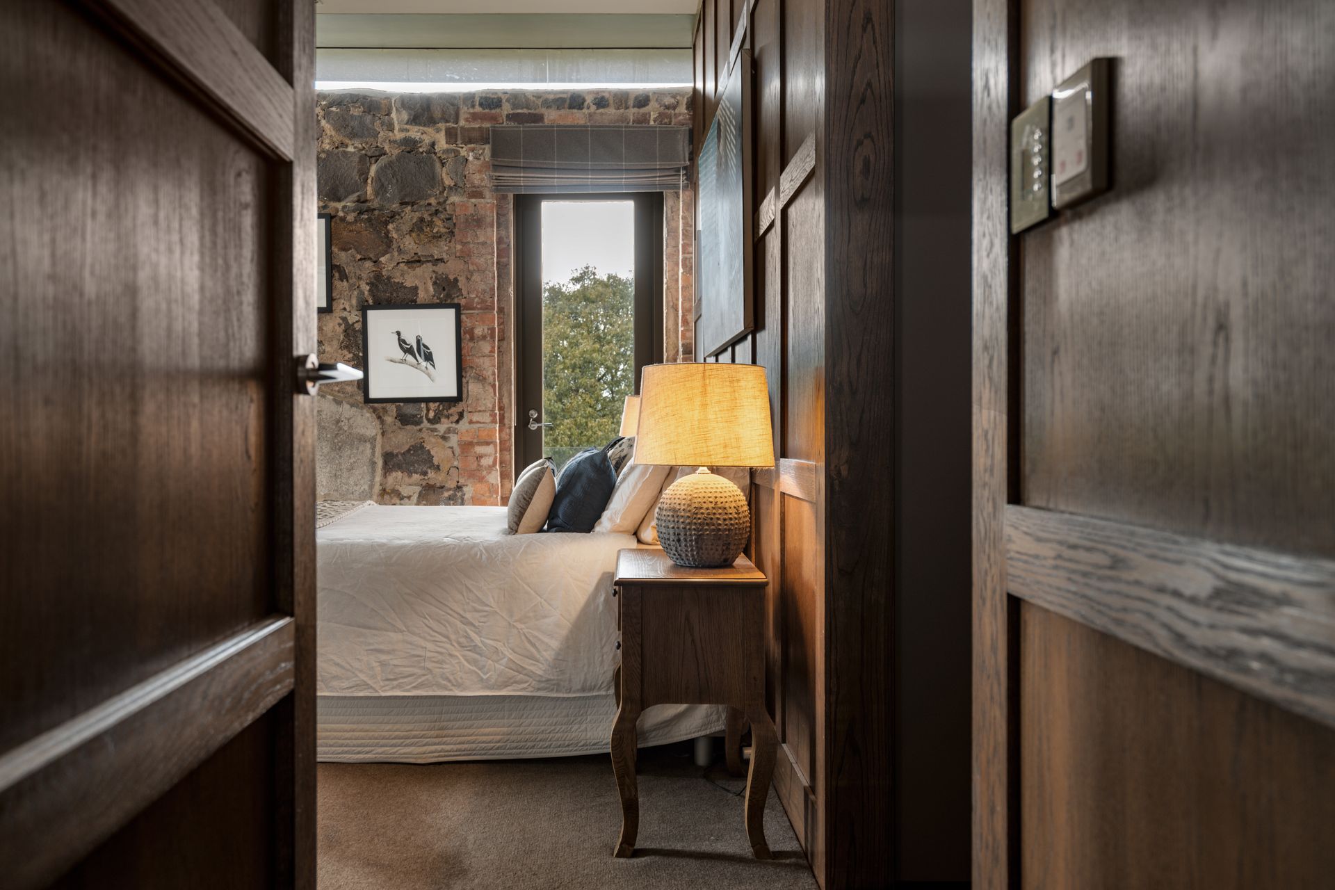 The 1850s original homestead fuses effortlessly into a contemporary masterpiece, preserving its heritage soul while introducing bold architectural flair and panoramic views across the plains. Original bluestone walls, aged hardwood lintels, and sashless windows preserve the 19th-century charm, while a striking industrial steel staircase and expansive glass panel above the stone wall flood the interior with natural light beneath a soaring metal roof. The entertainer’s kitchen features an Aga oven, two Miele ovens, dual dishwashers, and a gas cooktop. The principal suite offers views to Mt Kooroocheang, with a private balcony, ensuite, den, and study. Two generous guest bedrooms share a spa bathroom and lounge. The self-contained barn apartment has the fourth bedroom and includes a lounge, bathroom, and kitchenette.