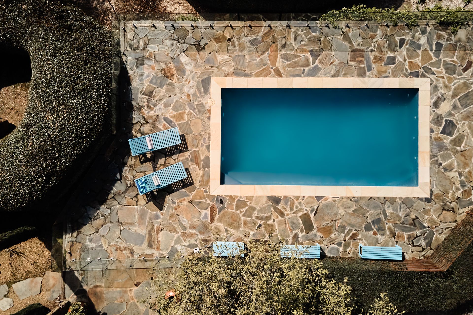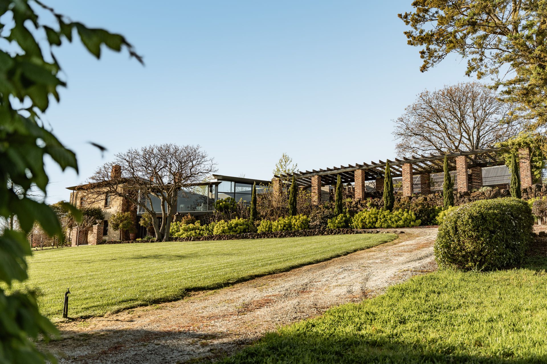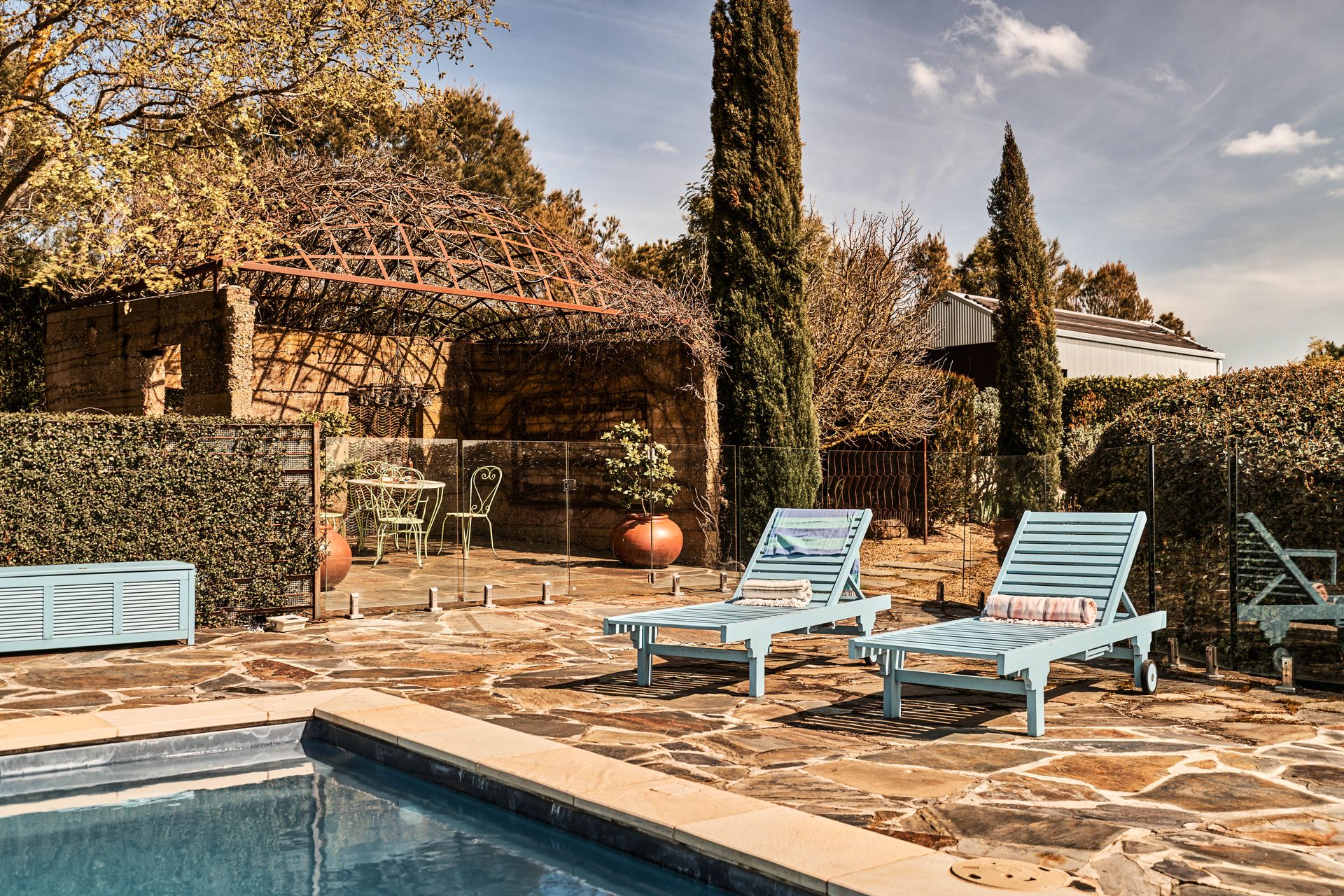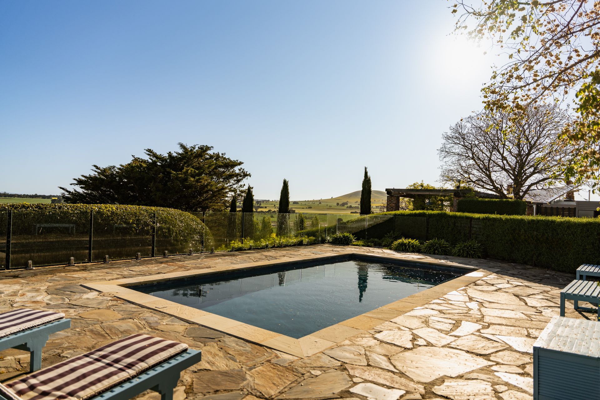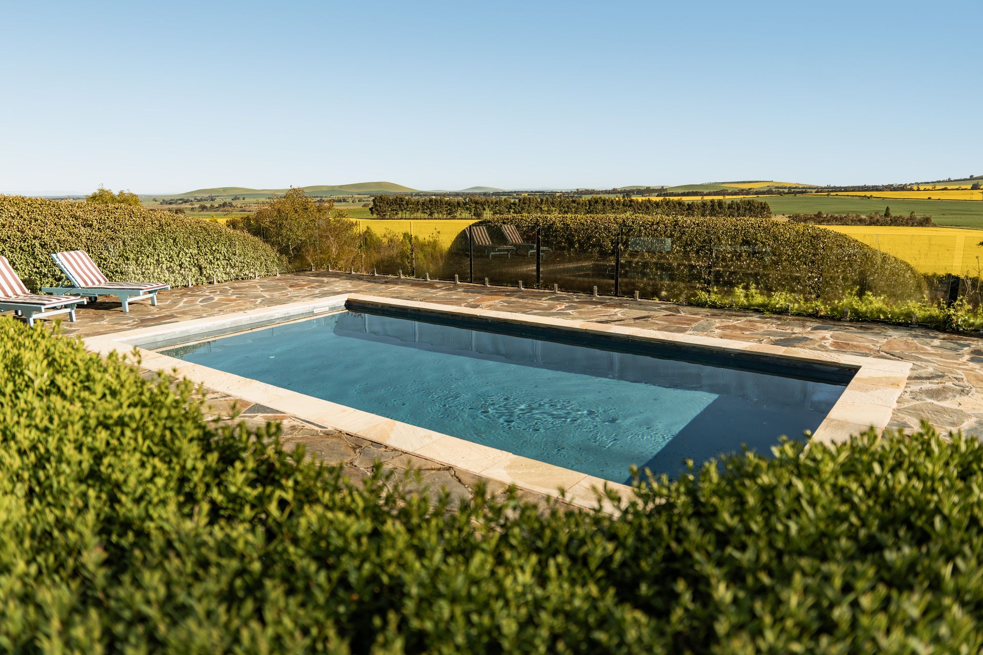 Outside, the estate unfolds into formal terraced gardens, two hectares of paddocks (home to alpacas and hand-raised sheep), and one of Victoria’s largest edible domestic gardens — a lush maze of fruit trees and shrubs that feels like something out of a fairytale. The garden is exquisite: a marquee lawn framed by steel-raised beds with 160 award-winning rose bushes and over 350 fruit trees and edible plants supplying top-tier local restaurants. Sculptural and architectural elements blend classical and modern artistry. A standout feature is the luxurious heated pool with deck and sweeping panoramic views.